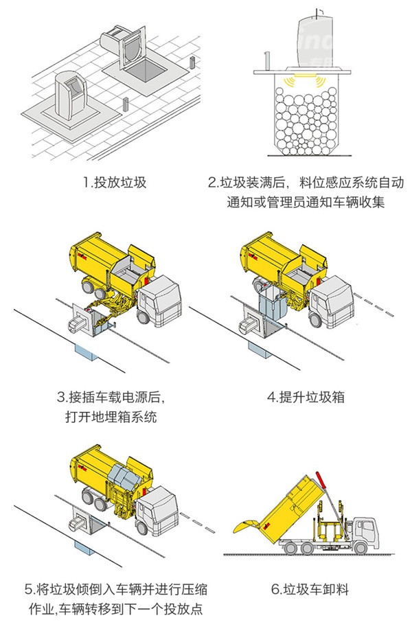 地埋垃圾桶不需提供動力,選址更具靈活性,在城市和農(nóng)村均可安裝,標(biāo)準(zhǔn)容積3.5m3、3m3、2.5m3和2m3,地埋桶提料機構(gòu)既適配袋裝垃圾投料,也適配手推車或電動垃圾收集車投料。