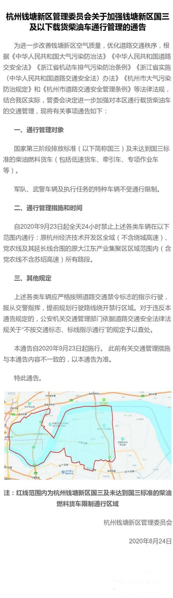 2020年9月23日起,國(guó)三及未達(dá)到國(guó)三標(biāo)準(zhǔn)的柴油燃料貨車(chē)全天24小時(shí)禁止在原杭州經(jīng)濟(jì)技術(shù)開(kāi)發(fā)區(qū)全域(不含繞城高速)、黨農(nóng)線及其延長(zhǎng)線合圍的原大江東產(chǎn)業(yè)集聚區(qū)區(qū)域范圍內(nèi)(含黨農(nóng)線不含蘇紹高速)所有路段通行,具體詳見(jiàn):