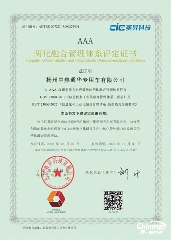 2022年12月2日,揚州中集通華專用車有限公司正式獲得國家工信部兩化融合評定機構簽發(fā)的“兩化融合管理體系AAA級評定證書”,成為國內半掛車行業(yè)首家通過兩化融合AAA級認證的企業(yè)。