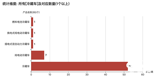 本次公告中的62款冷藏車共包含5種車型,冷藏車(52輛)、純電動(dòng)冷藏車(7輛)、插電式混合動(dòng)力冷藏車(1輛)、換電式純電動(dòng)冷藏車(1輛)、燃料電池冷藏車(1輛)。