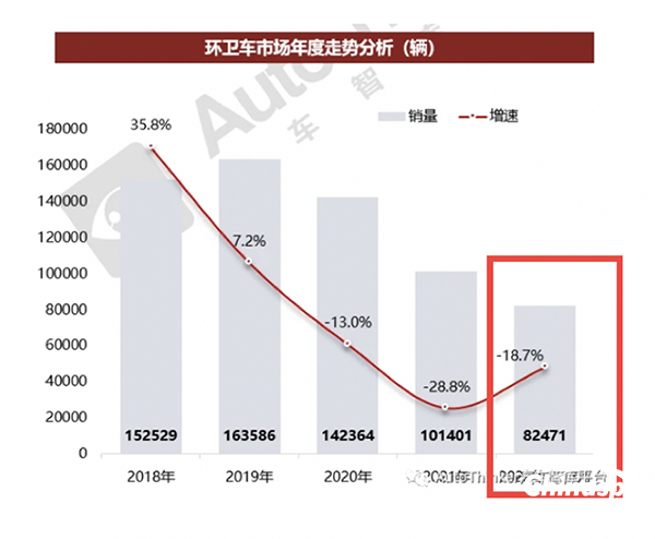 根據(jù)汽車智庫平臺提供的終端上牌數(shù)據(jù),2022年12月環(huán)衛(wèi)車銷售5748輛(見截圖1),同比(2021年12月環(huán)衛(wèi)車銷售8891輛)下降35.5%,2022年全年環(huán)衛(wèi)車?yán)塾?jì)銷售82471輛,同比(2021年環(huán)衛(wèi)車銷售101401輛)下降18.7%,成為連續(xù)3年同比下滑的年份(見截圖2)。據(jù)分析主要是受疫情和經(jīng)濟(jì)下行的雙重影響,部分地方政府財(cái)政壓力較大,對環(huán)衛(wèi)車的采購資金進(jìn)行縮減所致。