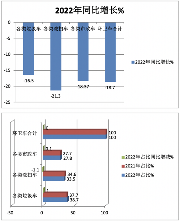 上圖表顯示,按功能用途劃分,在2022年各類環(huán)衛(wèi)車銷量同比、占比及占比同比變化呈現(xiàn)以下特點(diǎn):