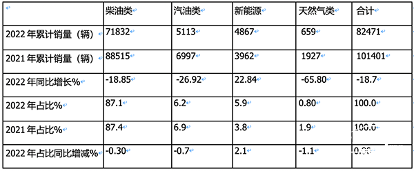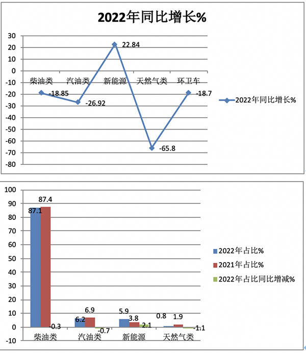 ---2022年柴油類環(huán)衛(wèi)車?yán)塾?jì)銷售71832輛,同比下降18.85%,跑輸大盤,市場占比87.1%,占主體地位,但占比同比減少0.3個(gè)百分點(diǎn);