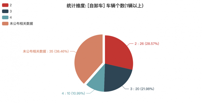 本次公告中的91款自卸車中,2軸(26輛,占比28.57%)、3軸(20輛,占比21.98%)、4軸(10輛,占比10.99%)、未公布相關(guān)數(shù)據(jù)(35輛,占比38.46%)。![]()