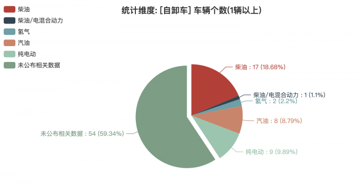 本次公告中的91款自卸車中,柴油(17輛,占比18.68%)、柴油/電混合動(dòng)力(1輛,占比1.1%)、氫氣(2輛,占比2.2%)、汽油(8輛,占比8.79%)、純電動(dòng)(9輛,占比9.89%)、未公布相關(guān)數(shù)據(jù)(54輛,占比59.34%)。![]()