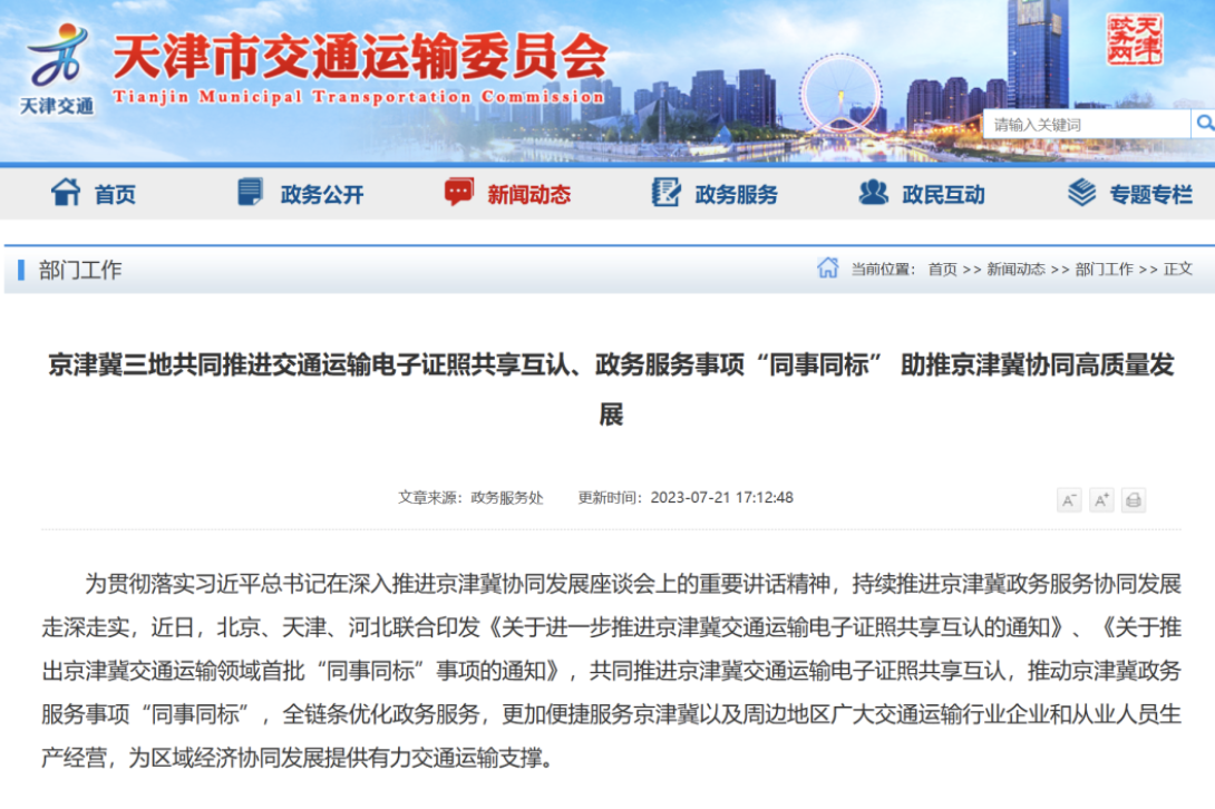 2023年7月27日第一專用車網記者獲悉,日前,北京市、天津市、河北省聯(lián)合印發(fā)《關于進一步推進京津冀交通運輸電子證照共享互認的通知》《關于推出京津冀交通運輸領域首批“同事同標”事項的通知》,共同推進三地交通運輸電子證照共享互認、政務服務事項同標準辦理。