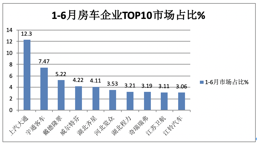 1、在2023年1-6月房車?yán)塾?jì)銷量TOP10中: