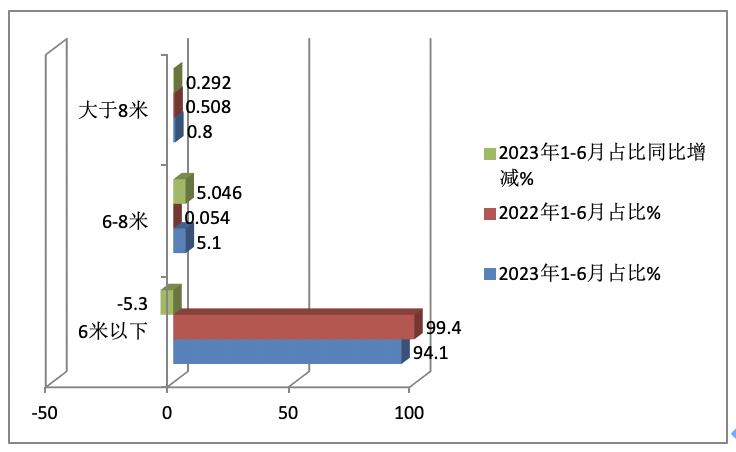 ----2023年1-6月8米段以上房車?yán)塾?jì)銷售62輛,市場(chǎng)占比為0.8%,居最小,占比同比增加0.292個(gè)百分點(diǎn),是占比同比增加第二多的細(xì)分車型。