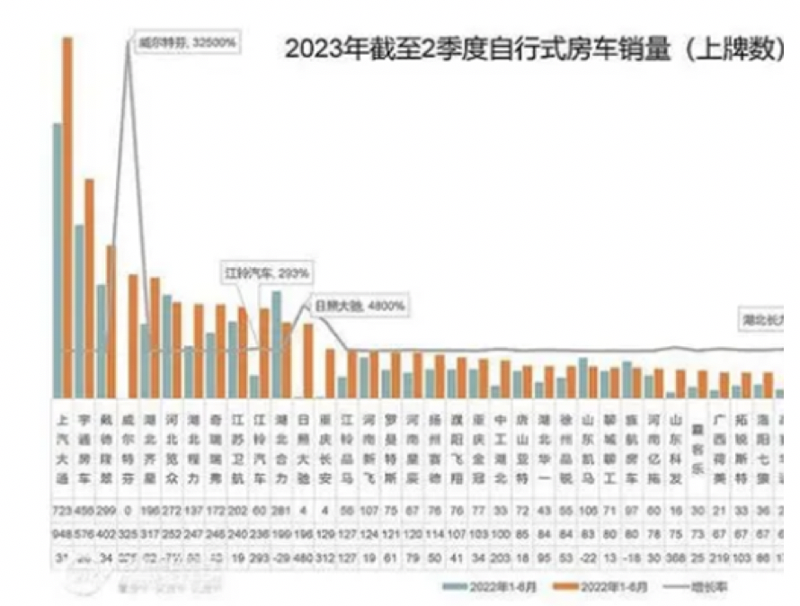 截圖2,2023年1-6月主流車企的國(guó)產(chǎn)自行式房車銷量及同比(數(shù)據(jù)來(lái)源:21世紀(jì)房車提供的上牌信息)