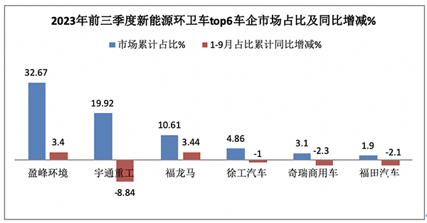 表4, 2023年1-9月新能源環(huán)衛(wèi)車TOP6銷量同比、占比及占比同比增減(數據來源:終端上牌數據)