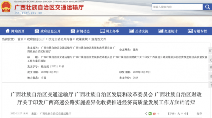 據(jù)廣西交通運(yùn)輸廳消息,從2024年1月1日起到2026年12月31日止,廣西高速公路將全面實(shí)施差異化收費(fèi):![]()
