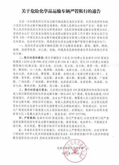 凡在限行時(shí)段途經(jīng)105國(guó)道路段的和在限行時(shí)段進(jìn)入限行路段的危險(xiǎn)化學(xué)品運(yùn)輸車輛一律從G45大廣高速、復(fù)線南龍高速、G535國(guó)道繞行,涉及國(guó)計(jì)民生運(yùn)輸、企業(yè)生產(chǎn)等方面,確需進(jìn)入化工園區(qū)的危險(xiǎn)化學(xué)品運(yùn)輸車輛,持機(jī)動(dòng)車行駛證、駕駛?cè)思把哼\(yùn)員從業(yè)資格證、企業(yè)營(yíng)業(yè)執(zhí)照等相關(guān)材料至龍南市公安局交通管理大隊(duì)辦理臨時(shí)通行,審批通過后,由G45大廣高速龍南南下高速進(jìn)入化工園區(qū)臨時(shí)通行,辦理地點(diǎn):龍南市公安局交通管理大隊(duì)(客屬大道汽車站旁),聯(lián)系電話:0797-3557586。