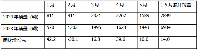 2024年1-5月清障車累計銷售7899輛,同比2023年1-5月的6934輛增長14%。