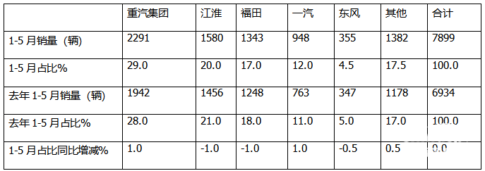 按底盤企業(yè)劃分,今年1-5月搭載重汽底盤的清障車累計銷量2291輛,占比近3成(29%),居榜首;居第二的是搭載江淮汽車底盤的清障車累計銷售1580輛,占比2成(20%);居第三的是搭載福田底盤的清障車累計銷售1343輛,占比17%;