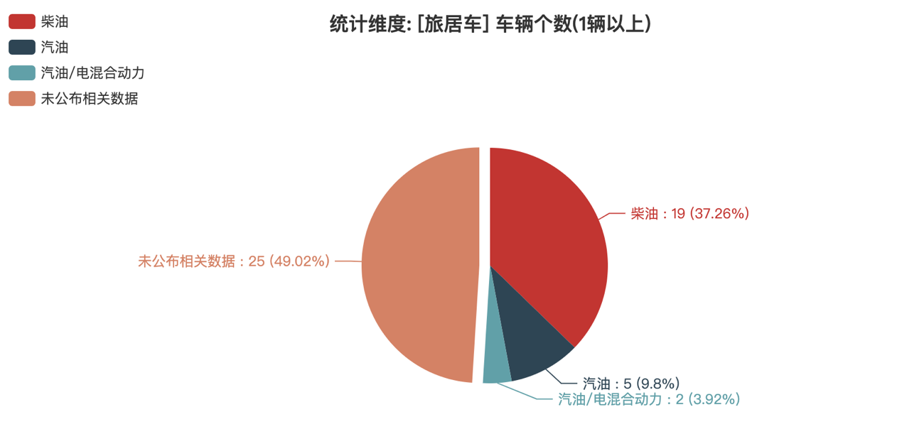 本次公告中的51款旅居車中,燃油種類情況如下:柴油(19輛,占比37.25%)、汽油(5輛,占比9.8%)、汽油/電混合動力(2輛,占比3.92%)、未公布相關(guān)數(shù)據(jù)(25輛,占比49.02%)。