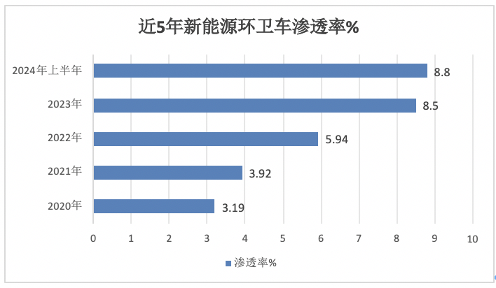 1、2024上半年新能源環(huán)衛(wèi)車滲透率為8.8%,同比提升2.7個百分點。