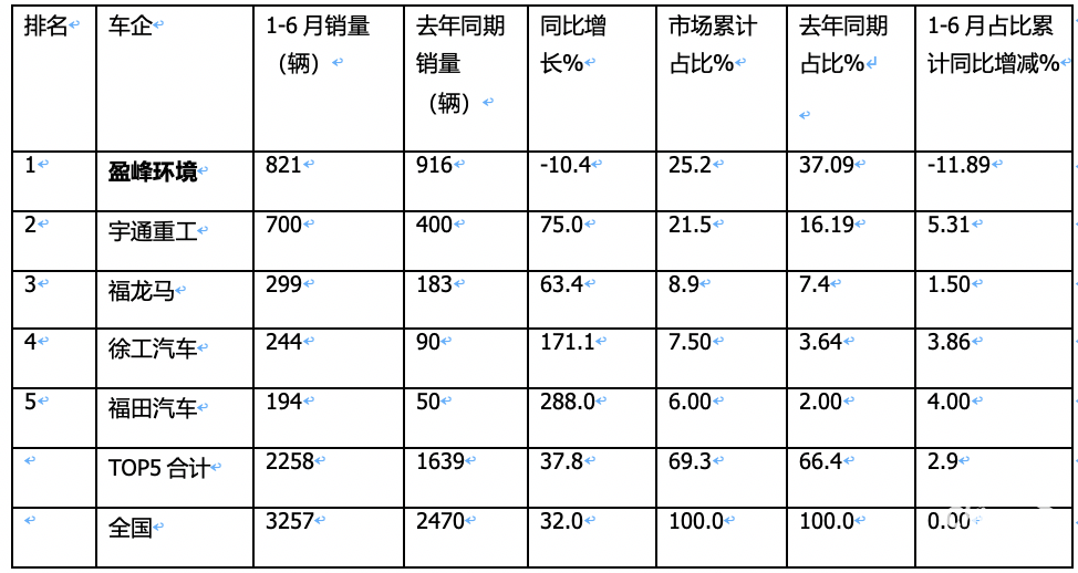 在今年前6月新能源環(huán)衛(wèi)車市場競爭格局中,盈峰環(huán)境領(lǐng)跑,但占比同比市場份額減少最多;宇通占比同比增加5.31個百分點,是占比同比增加最多的車企,表現(xiàn)搶眼。