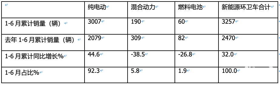 ---混合動力車輛累計銷售190輛,同比下降38.5%,跑贏并領(lǐng)跌今年1-6月新能源環(huán)衛(wèi)車大盤;