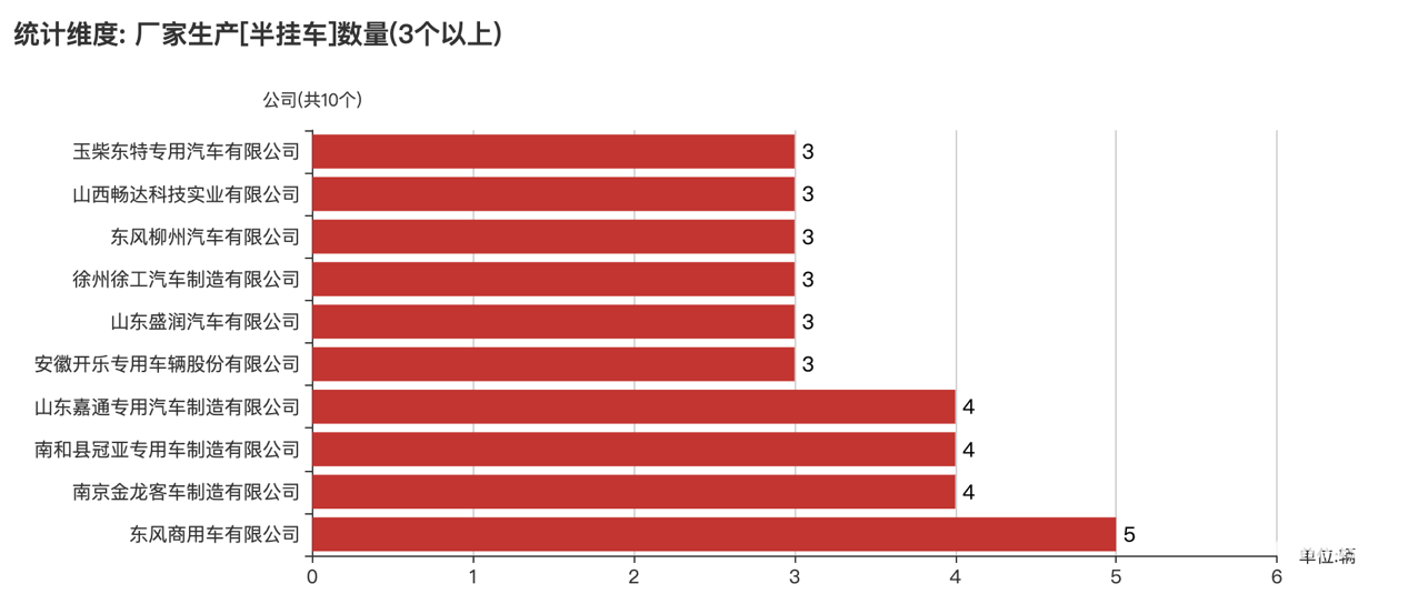 本次公告中的113款半掛車的生產(chǎn)企業(yè)共有73家,東風(fēng)商用車有限公司(5輛)、山東嘉通專用汽車制造有限公司(4輛)、南京金龍客車制造有限公司(4輛)、南和縣冠亞專用車制造有限公司(4輛)、山西暢達(dá)科技實業(yè)有限公司(3輛)、山東盛潤汽車有限公司(3輛)、安徽開樂專用車輛股份有限公司(3輛)、東風(fēng)柳州汽車有限公司(3輛)、徐州徐工汽車制造有限公司(3輛)、玉柴東特專用汽車有限公司(3輛)、中國第一汽車集團(tuán)有限公司(2輛)、成安縣森陽交通設(shè)備制造有限公司(2輛)、鄭州宇通集團(tuán)有限公司(2輛)、河北匯達(dá)能源有限公司(2輛)、蚌埠樂虎汽車零部件有限公司(2輛)、駐馬店中集華駿車輛有限公司(2輛)、河南亞特車輛有限公司(2輛)、湖北力威汽車有限公司(2輛)、中石油江漢機(jī)械研究所有限公司(2輛)、河北昌驊專用汽車有限公司(2輛)、中集車輛(集團(tuán))股份有限公司(2輛)、青縣金銳專用汽車制造有限公司(2輛)、山東駿華車輛有限公司(2輛)、湖北世紀(jì)中遠(yuǎn)車輛有限公司(2輛)、通亞汽車制造有限公司(2輛)等。