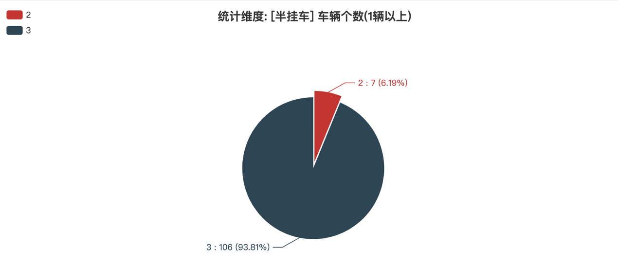本次公告中的113款半掛車中,車型軸數(shù)情況如下:2(7輛,占比6.19%)、3(106輛,占比93.81%)。