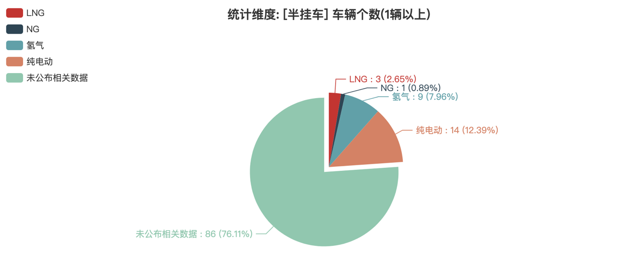 本次公告中的113款半掛車中,LNG(3輛,占比2.65%)、NG(1輛,占比0.88%)、氫氣(9輛,占比7.96%)、純電動(14輛,占比12.39%)、未公布相關(guān)數(shù)據(jù)(86輛,占比76.11%)。