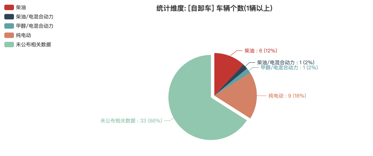 本次公告中的50款自卸車中,柴油(6輛,占比12%)、柴油/電混合動(dòng)力(1輛,占比2%)、甲醇/電混合動(dòng)力(1輛,占比2%)、純電動(dòng)(9輛,占比18%)、未公布相關(guān)數(shù)據(jù)(33輛,占比66%)。