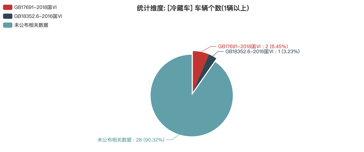 本次公告中的31款冷藏車(chē)中,排放標(biāo)準(zhǔn)情況如下:GB17691-2018國(guó)Ⅵ(2輛,占比6.45%)、GB18352.6-2016國(guó)Ⅵ(1輛,占比3.23%)、未公布相關(guān)數(shù)據(jù)(28輛,占比90.32%)。