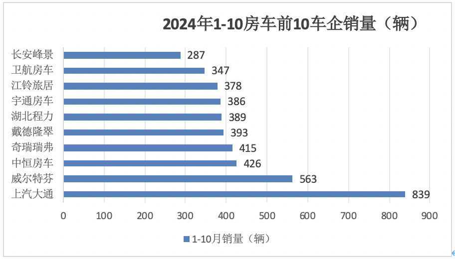 上圖可見,在2024年1-10月國內(nèi)房車銷量中:大通威爾特芬湖北中恒居前三;累計銷量分別為839輛、563輛和426輛,其中上汽大通一家唯一超800輛。
