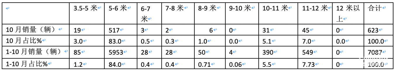 ---10-11米段車型分別銷售31輛和390輛,市場占比分別為5.1%和5.5%,均居第三;