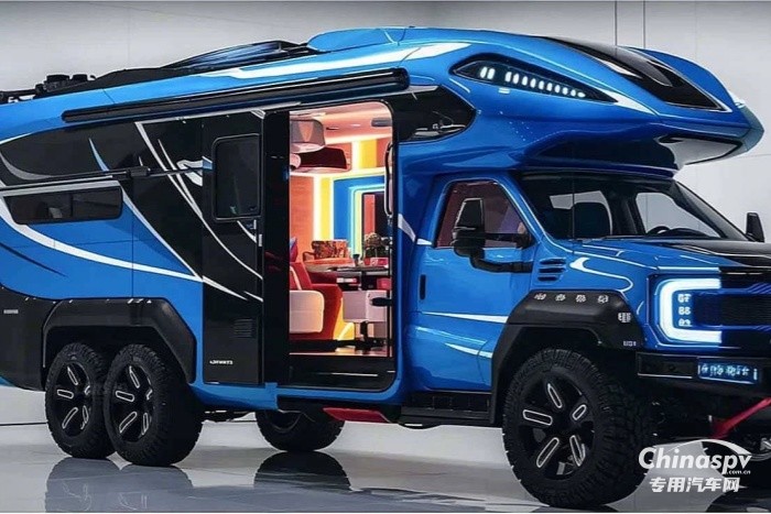 從設計上看,這款房車將功能性與豪華感完美融合,是長途旅行的理想之選,能為乘客提供極致的舒適體驗。電動化的設計理念,讓它有望在舒適性、續(xù)航能力和可持續(xù)性之間實現(xiàn)完美平衡。其外觀采用金屬藍色涂裝搭配黑色細節(jié),堅固的強化保險杠和LED照明系統(tǒng),賦予它極具未來感的外觀。