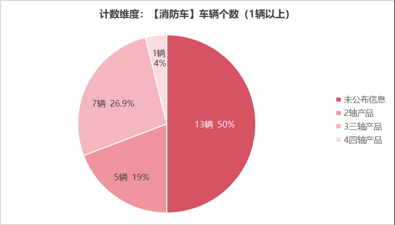 本次公告中的26款消防車(chē)中,2軸(5輛,占比19.2%)、3軸(7輛,占比26.9%)、4軸(1輛,占比3.8%)、未公布相關(guān)數(shù)據(jù)(13輛,占比50.0%)。