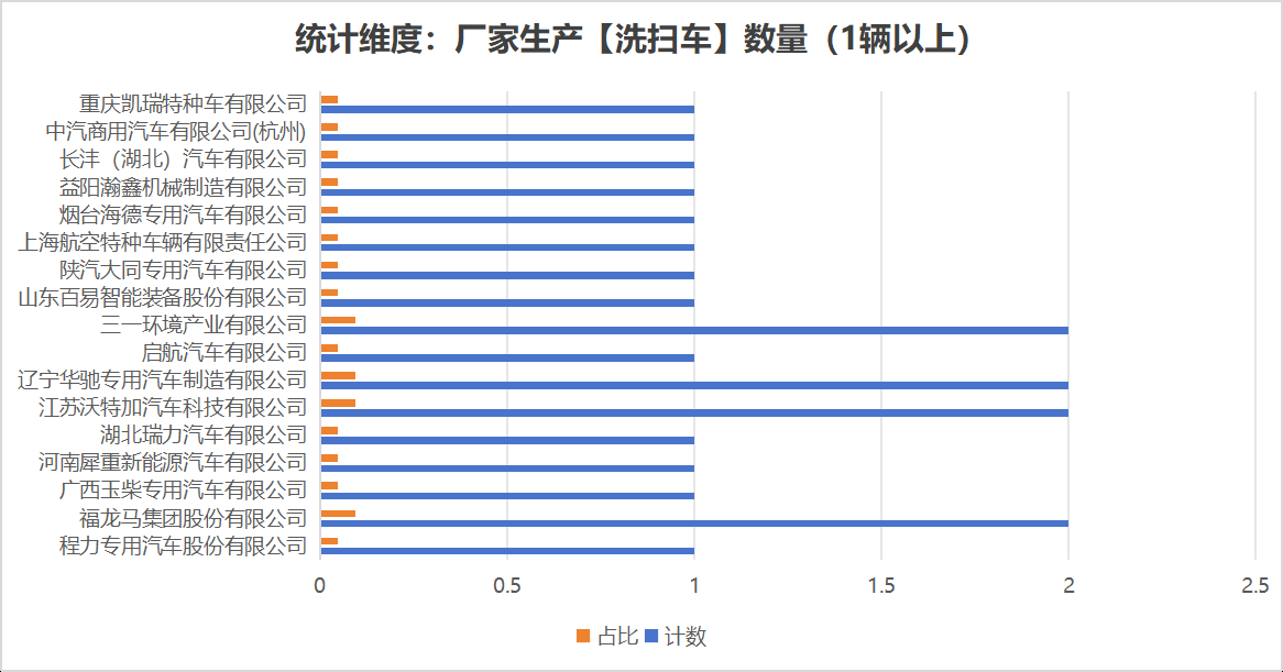 未公布數(shù)據(jù)的洗掃車成產(chǎn)企業(yè)以及數(shù)量如下:程力專用汽車股份有限公司(1輛)。