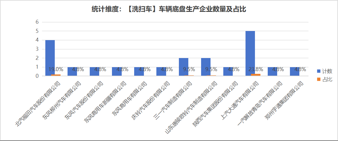 本次公告中的21款洗掃車的底盤生產(chǎn)企業(yè)共有12家,北汽福田汽車股份有限公司(4輛,占比19.0%)、東風(fēng)柳州汽車有限公司(1輛,占比4.8%)、東風(fēng)汽車股份有限公司(1輛,占比4.8%)、東風(fēng)商用車新疆有限公司(1輛,占比4.8%)、東風(fēng)商用車有限公司(1輛,占比4.8%)、慶鈴汽車股份有限公司(1輛,占比4.8%)、三一汽車制造有限公司(2輛,占比9.5%)、山東唐駿歐鈴汽車制造有限公司(2輛,占比9.5%)、陜西汽車集團(tuán)股份有限公司(1輛,占比4.8%)、上汽大通汽車有限公司(5輛,占比23.8%)、一汽解放青島汽車有限公司(1輛,占比4.8%)、鄭州宇通集團(tuán)有限公司(1輛,占比4.8%)。本次公告中的21款洗掃車中,均采用二類底盤。