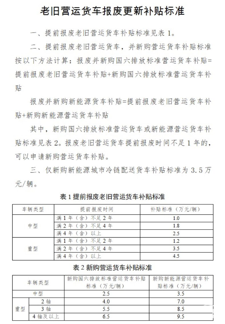 支持國(guó)三、國(guó)四排放標(biāo)準(zhǔn)營(yíng)運(yùn)貨車報(bào)廢更新,加快更新一批高標(biāo)準(zhǔn)低排放營(yíng)運(yùn)貨車。對(duì)提前報(bào)廢老舊營(yíng)運(yùn)貨車、提前報(bào)廢并更新購(gòu)置國(guó)六排放標(biāo)準(zhǔn)貨車或新能源貨車、僅新購(gòu)符合條件的新能源貨車,按照?qǐng)?bào)廢車輛類型、提前報(bào)廢時(shí)間和新購(gòu)置車輛動(dòng)力類型等,實(shí)施差別化補(bǔ)貼標(biāo)準(zhǔn)(見附件1)。 上述補(bǔ)貼政策實(shí)施期限為2025年1月1日至2025年12月31日(報(bào)廢貨車《報(bào)廢機(jī)動(dòng)車回收證明》《機(jī)動(dòng)車注銷證明》日期、新購(gòu)置貨車《機(jī)動(dòng)車行駛證》注冊(cè)登記日期和《道路運(yùn)輸證》發(fā)放日期均應(yīng)在政策實(shí)施期內(nèi))