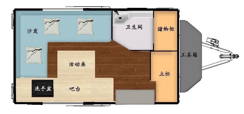 旁邊是儲物柜及衛(wèi)生間,儲物柜可以放置一些休息時所使用的被褥枕頭及換洗衣物等,衛(wèi)生間配備洗手池淋浴花灑、便攜式馬桶。