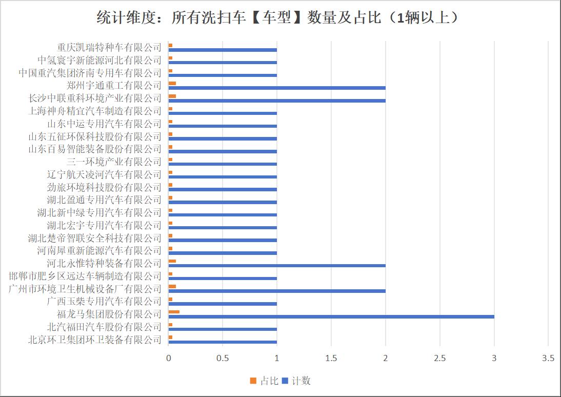 本次公告中的30款洗掃車的生產(chǎn)企業(yè)共有24家,北京環(huán)衛(wèi)集團(tuán)環(huán)衛(wèi)裝備有限公司(1輛)、北汽福田汽車股份有限公司(1輛)、福龍馬集團(tuán)股份有限公司(3輛)、廣西玉柴專用汽車有限公司(1輛)、廣州市環(huán)境衛(wèi)生機(jī)械設(shè)備廠有限公司(2輛)、邯鄲市肥鄉(xiāng)區(qū)遠(yuǎn)達(dá)車輛制造有限公司(1輛)、河北永惟特種裝備有限公司(2輛)、河南犀重新能源汽車有限公司(1輛)、湖北楚帝智聯(lián)安全科技有限公司(1輛)、湖北宏宇專用汽車有限公司(1輛)、湖北新中綠專用汽車有限公司(1輛)、湖北盈通專用汽車有限公司(1輛)、勁旅環(huán)境科技股份有限公司(1輛)、遼寧航天凌河汽車有限公司(1輛)、三一環(huán)境產(chǎn)業(yè)有限公司(1輛)、山東百易智能裝備股份有限公司(1輛)、山東五征環(huán)保科技股份有限公司(1輛)、山東中運(yùn)專用汽車有限公司(1輛)、上海神舟精宜汽車制造有限公司(1輛)、長(zhǎng)沙中聯(lián)重科環(huán)境產(chǎn)業(yè)有限公司(2輛)、鄭州宇通重工有限公司(2輛)、中國(guó)重汽集團(tuán)濟(jì)南專用車有限公司(1輛)、中氫寰宇新能源河北有限公司(1輛)、重慶凱瑞特種車有限公司(1輛)。