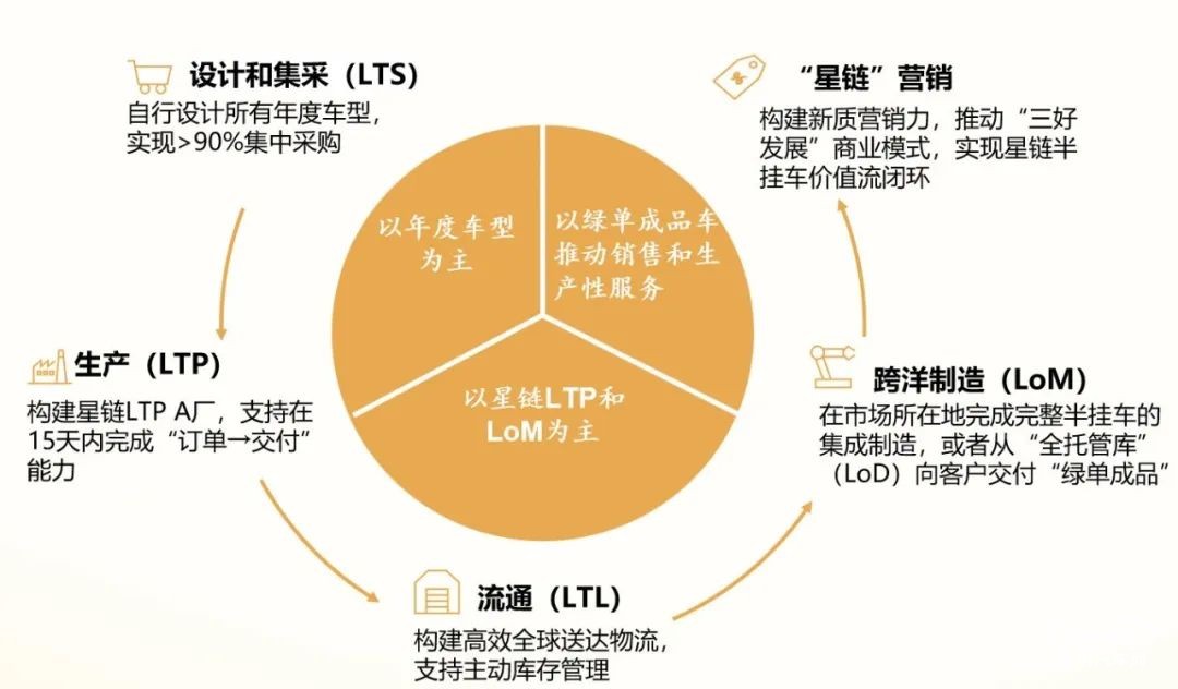 2023年3月,中集車輛啟動(dòng)“星鏈計(jì)劃”,聚焦自身最為核心的半掛車業(yè)務(wù),展開(kāi)生產(chǎn)組織結(jié)構(gòu)改革,重新定義從設(shè)計(jì)和集采、生產(chǎn)、流通、跨洋制造到營(yíng)銷的全價(jià)值鏈的五個(gè)環(huán)節(jié)。