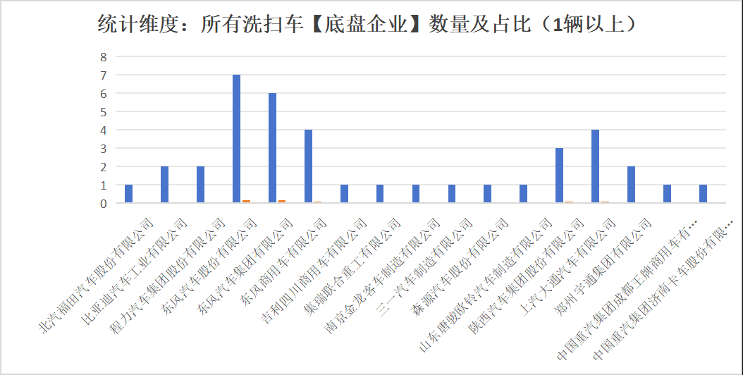 本次公告中的39款洗掃車的底盤生產(chǎn)企業(yè)共有17家,北汽福田汽車股份有限公司(1輛,占比2.6%)、比亞迪汽車工業(yè)有限公司(2輛,占比5.1%)、程力汽車集團(tuán)股份有限公司(2輛,占比5.1%)、東風(fēng)汽車股份有限公司(7輛,占比17.9%)東風(fēng)汽車集團(tuán)有限公司(6輛,占比15.4%)、東風(fēng)商用車有限公司(4輛,占比10.3%)、吉利四川商用車有限公司(1輛,占比2.6%)、集瑞聯(lián)合重工有限公司(1輛,占比2.6%)、南京金龍客車制造有限公司(1輛,占比2.6%)、三一汽車制造有限公司(1輛,占比2.6%)、森源汽車股份有限公司(1輛,占比2.6%)、山東唐駿歐鈴汽車制造有限公司(1輛,占比2.6%)、陜西汽車集團(tuán)股份有限公司(3輛,占比7.7%)、上汽大通汽車有限公司(4輛,占比10.3%)、鄭州宇通集團(tuán)有限公司(2輛,占比5.1%)、中國重汽集團(tuán)成都王牌商用車有限公司(1輛,占比2.6%)、中國重汽集團(tuán)濟(jì)南卡車股份有限公司(1輛,占比2.6%)。本次公告中的39款洗掃車中,均采用二類底盤。