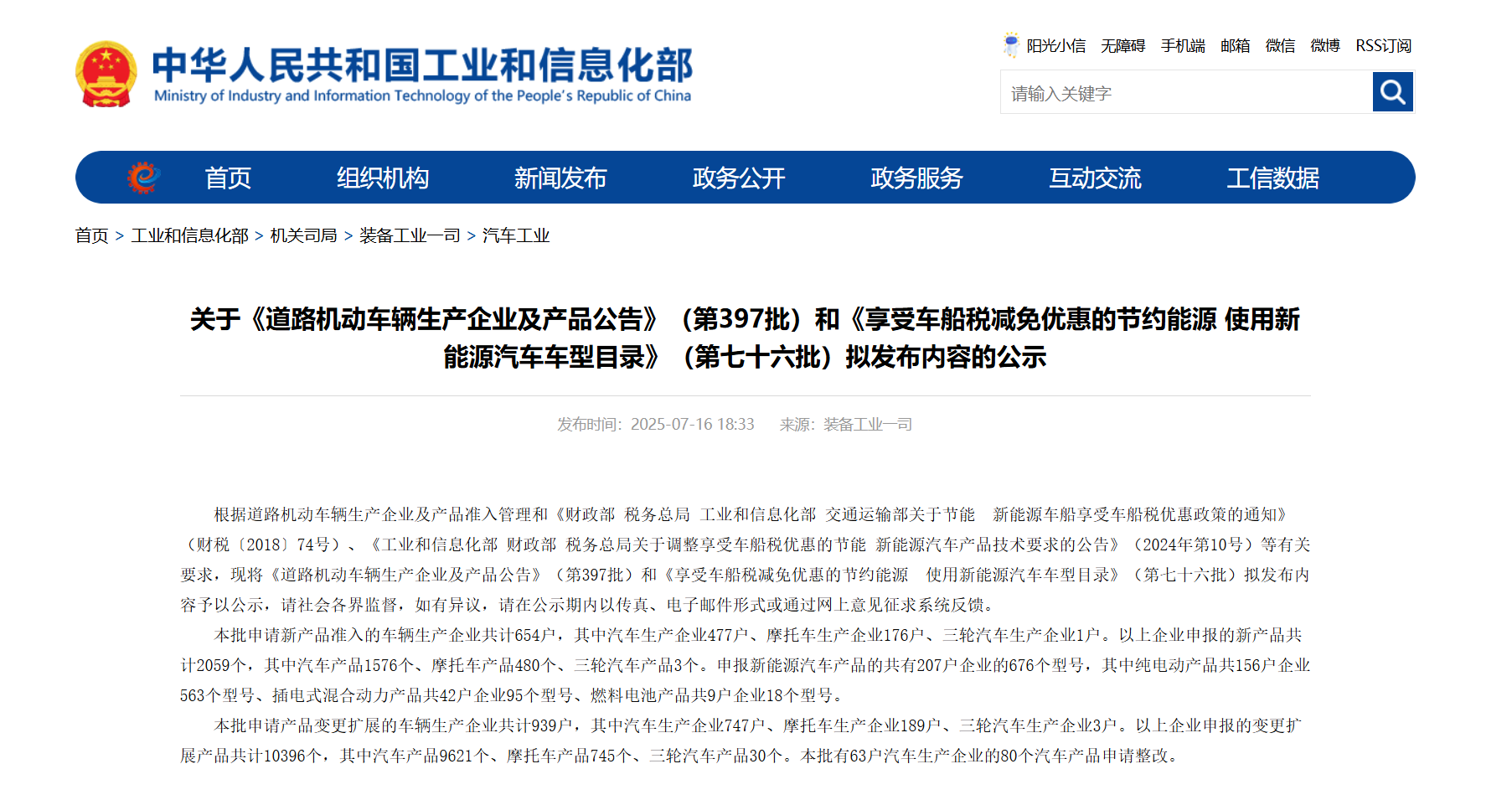 2025年,工業(yè)和信息化部第397批《道路機(jī)動(dòng)車輛生產(chǎn)企業(yè)及產(chǎn)品公告》(下稱《公告》),在官方網(wǎng)站正式公示。本批申請新產(chǎn)品準(zhǔn)入的車輛生產(chǎn)企業(yè)共計(jì)654戶,其中汽車生產(chǎn)企業(yè)477戶、摩托車生產(chǎn)企業(yè)176戶、三輪汽車生產(chǎn)企業(yè)1戶。以上企業(yè)申報(bào)的新產(chǎn)品共計(jì)2059個(gè),其中汽車產(chǎn)品1576個(gè)、摩托車產(chǎn)品480個(gè)、三輪汽車產(chǎn)品3個(gè)。申報(bào)新能源汽車產(chǎn)品的共有207戶企業(yè)的676個(gè)型號(hào),其中純電動(dòng)產(chǎn)品共156戶企業(yè)563個(gè)型號(hào)、插電式混合動(dòng)力產(chǎn)品共42戶企業(yè)95個(gè)型號(hào)、燃料電池產(chǎn)品共9戶企業(yè)18個(gè)型號(hào)。