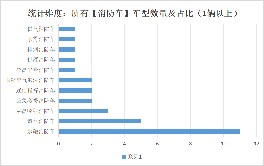 本次公告中的30款消防車的車型共有11種,水罐消防車(11輛)、器材消防車(5輛)、舉高噴射消防車(3輛)、應(yīng)急救援消防車(2輛)、通信指揮消防車(2輛)、壓縮空氣泡沫消防車(2輛)、登高平臺(tái)消防車(1輛)、供液消防車(1輛)、排煙消防車(1輛)、水霧消防車(1輛)、供氣消防車(1輛)。