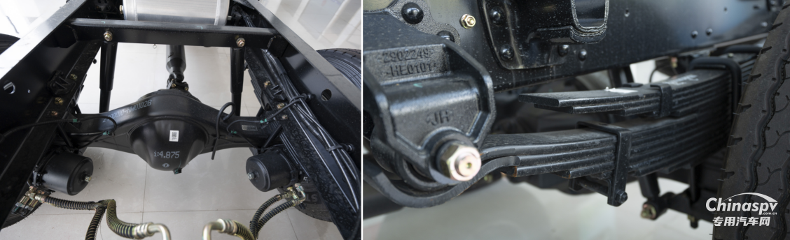 車架采用高強(qiáng)度鋼材,全鉚接結(jié)構(gòu),寬車架設(shè)計(jì),承載更堅(jiān)固。配合高強(qiáng)度多片簧懸架,7.00R16輪胎與加強(qiáng)鋼輪轂,前后鼓式制動(dòng)系統(tǒng),提升復(fù)雜路況下的穩(wěn)定性和安全性。后橋采用冷鏈專用4.33小速比后橋,支持4噸、6噸級(jí)后橋選擇,以滿足不同使用場(chǎng)景用戶的多樣化需求。