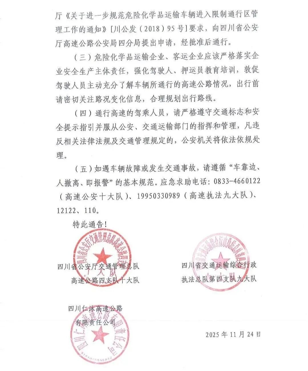 如遇車輛故障或發(fā)生交通事故,請(qǐng)遵循“車靠邊、人撤離、即報(bào)警”的基本規(guī)范。應(yīng)急求助電話:0833-4660122(高速公安十大隊(duì))、19950330989(高速執(zhí)法九大隊(duì))、12122、110。