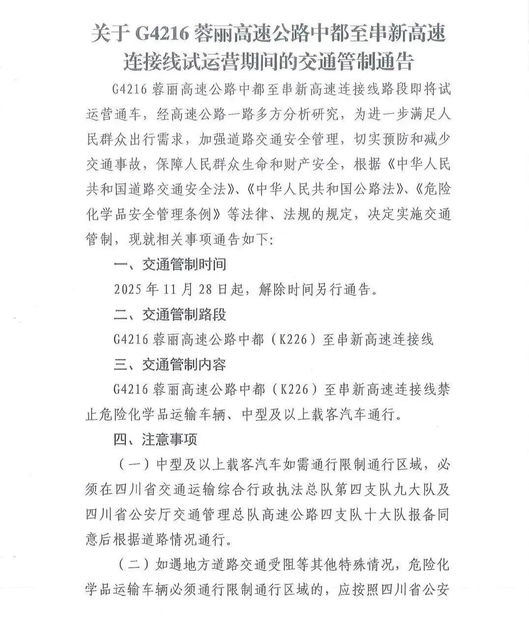 G4216蓉麗高速公路中都至串新高速連接線路段即將試運(yùn)營(yíng)通車,經(jīng)高速公路一路多方分析研究,為進(jìn)一步滿足人民群眾出行需求,加強(qiáng)道路交通安全管理,切實(shí)預(yù)防和減少交通事故,保障人民群眾生命和財(cái)產(chǎn)安全,根據(jù)《中華人民共和國(guó)道路交通安全法》、《中華人民共和國(guó)公路法》、《危險(xiǎn)化學(xué)品安全管理?xiàng)l例》等法律、法規(guī)的規(guī)定,決定實(shí)施交通管制,現(xiàn)就相關(guān)事項(xiàng)通告如下: