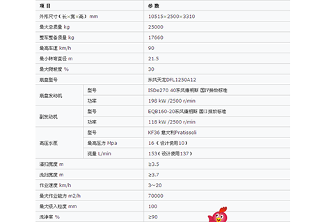 底盤:東風(fēng)天龍DFL1250A12型25噸二類汽車底盤,是目前國產(chǎn)最先進、質(zhì)量最可靠的國4商用車底盤。采用了東風(fēng)康明斯ISDe270 40柴油發(fā)動機,功率198kw,額定轉(zhuǎn)速2500r/min,排放按國4標(biāo)準。