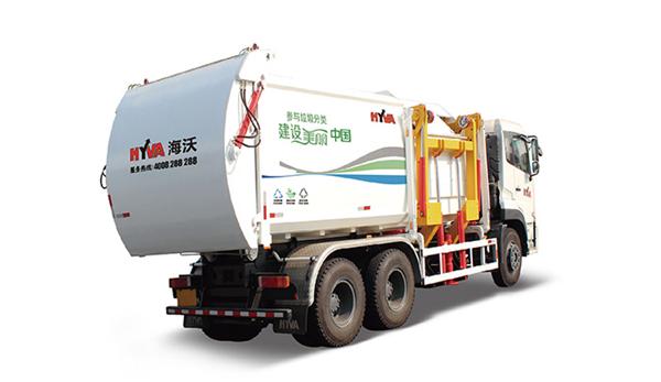 特殊提料機構(gòu),可以將地埋垃圾桶處置提升并在最高位翻轉(zhuǎn)卸料,不造成垃圾泄露。