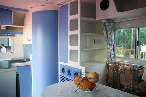 車內空間看似狹小,但利用率高、功能齊全。配有U型沙發(fā)(可拼成1640mm×1940mm的床),衛(wèi)生間,影音系統(tǒng),燃氣冰箱,燃氣暖風,燃氣熱水器,燃氣灶等各種設施,還可選裝窗式駐車空調。