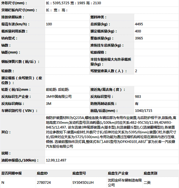 華晨汽車金杯牌JBT5045ZYS壓縮式垃圾車