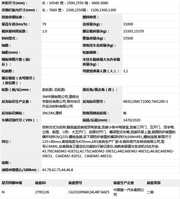 公告型號(hào) CA5310ZLJP66K24L4T4AE5