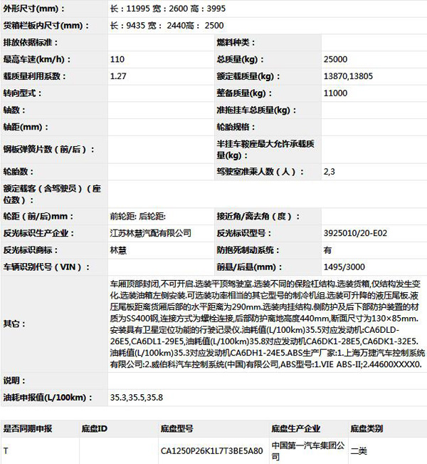 公告型號(hào) CA5250XLCP26K1L7T3E5A80