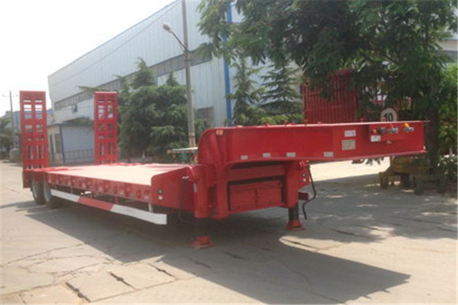 備注 該車僅可運輸不可拆解物體,鵝頸部分不允許載貨;鵝頸部分最大寬度為1500mm;輪胎可外露樣可不外露;貨臺承載面離地高度可為1150mm,1100mm,1000mm,950mm,900mm;車輛的長度/軸距/后懸(mm)對應關系為:13000/9600+1300/1100,12530/9370+1300/1330,12530/9200+1300/1500,12230/9150+1300/1330,12230/8980+1300/1500,12000/450/8750+1300/1500;此車選裝前鵝頸樣式,選裝液壓爬梯結構,該車還可選裝單簧爬梯,雙簧爬梯及三簧爬梯;選裝輪胎上方外露或不外露;尾部可選裝無斜坡;車身縱梁之間選裝通體圓弧,部分圓弧,通體垂直下凹及部分垂直下凹;尾部爬梯及支架收起狀態(tài)超出車架的水平長度不超過300mm,該長度不在車輛長度測量范圍內(nèi);因選裝引起的質量變化均在3%內(nèi);ABS系統(tǒng)廠家為廣州瑞立科密汽車電子股份有限公司,廣州市西合汽車電子裝備有限公司,型號為CM2XL-4S/2K、XH-GQ4S2M-E01;側防護裝置材料采用Q235,連接方式為螺栓連接;后部結構具備后防護裝置功能,離地高度為410mm.